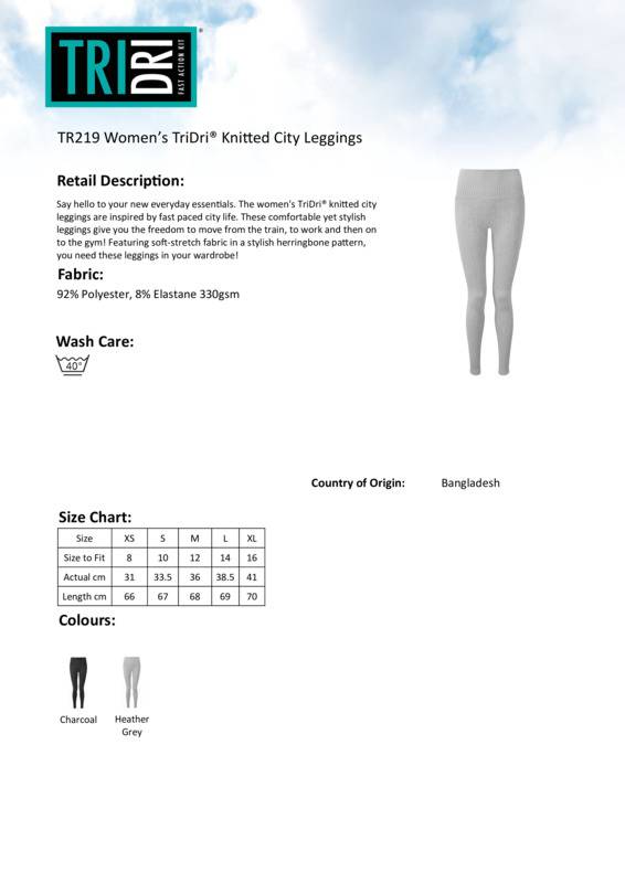 Say hello to your new everyday essentials. The women's TriDri® knitted city leggings are inspired by fast paced city life. These comfortable yet stylish leggings give you the freedom to move from the train, to work and then on to the gym! Featuring soft-stretch fabric in a stylish herringbone pattern, you need these leggings in your wardrobe!Knitted leggings with minimal seamsFull-length leggingsSoft-stretch fabricPocket to legDeep waistbandHerringbone patternWe recommend using block out vinyl and inks.Product contains no branded neck or waist labelRemovable Kimble or looped garment tagsInner seam label holds important product information on one label with a second label containing brand information which can be cut-away.Accreditations: WRAPAge Group: AdultFabric: 92% Polyester, 8% ElastaneGender: FemalePlus Size: NoProduct Type: LeggingsSize Range: XS to XLSizing To Fit: XS 8 S 10 M 12 L 14 XL 16Tag: Cut-away inner labelWashing Instructions: Wash at 40 degrees. Line dry. Do not bleach. Do not iron. Do not tumble dry. Do not dry clean. Wash with similar colours.Weight (GSM): 330gsm]]>