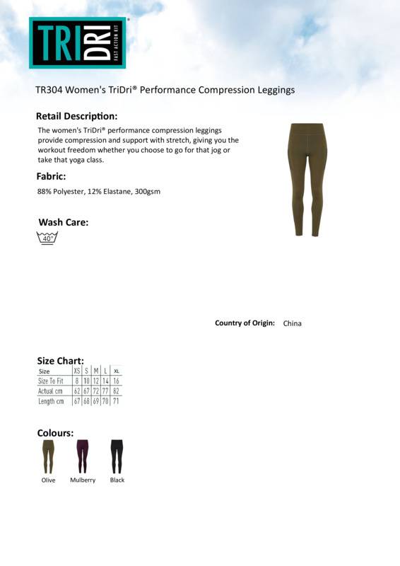The women's TriDri® performance compression leggings provide compression and support with stretch, giving you the workout freedom whether you choose to go for that jog or take that yoga class.Full-length leggingsSoft stretch fabricElasticated waistbandPocket inside waistband useful for storing locker keysCompression fit2 mesh phone pockets, one on each side of the legWe recommend using block out vinyl and inks.Product contains no branded neck or waist labelRemovable Kimble or looped garment tagsInner seam label holds important product information on one label with a second label containing brand information which can be cut-away.Accreditations: Amfori BSCIAge Group: AdultFabric: 88% Polyester, 12% ElastaneGender: FemalePlus Size: NoProduct Type: LeggingsSize Range: XS to XLSizing To Fit: XS 8 S 10 M 12 L 14 XL 16Tag: Cut-away inner labelWashing Instructions: 40c Domestic WashWeight (GSM): 300gsm]]>
