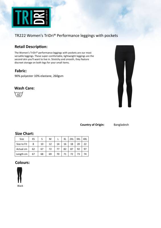 The women's TriDri® performance leggings with pockets are our most versatile leggings. These super-comfortable, lightweight leggings are the second skin you'll want to live in. Stretchy and smooth, they feature discreet storage on both legs for your small items.Full-length leggingsSoft-stretch fabricElasticated waistbandBlack inner waistband and coin pocketSide panels to legs with hidden insert pocketWe recommend using block out vinyl and inks.Product contains no branded neck or waist labelRemovable Kimble or looped garment tagsInner seam label holds important product information on one label with a second label containing brand information which can be cut-away.Accreditations: SEDEX|Amfori BSCIAge Group: AdultFabric: 90% Polyester, 10% ElastaneGender: FemalePlus Size: YesProduct Type: LeggingsSize Range: XXS to 4XLSizing To Fit: XXS 6 XS 8 S 10 M 12 L 14 XL 16 2XL 18 3XL 20 4XL 22Tag: Cut-away inner labelWashing Instructions: Machine wash at 40°C. Line dry. Wash with similar colours. Do not bleach. Do not iron. Do not tumble dry, Do not dry clean. Wash inside out.Weight (GSM): 260gsm]]>