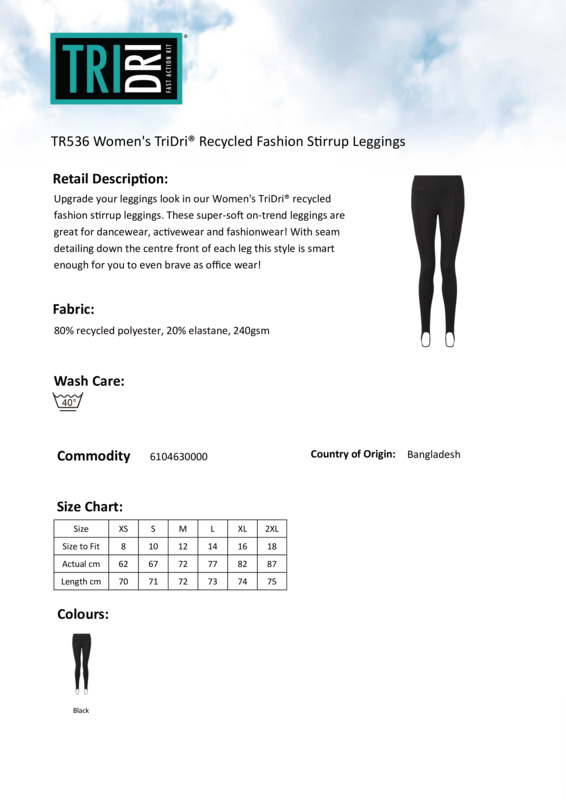 Upgrade your leggings look with the women’s TriDri® recycled fashion stirrup leggings. These super-soft, on-trend leggings are great for dancewear, activewear and fashionwear; and with seam detailing down the centre front of each leg, they can even be smart enough for officewear!Full-length leggingsSoft-stretch fabricSelf-fabric waistbandSeam detail through centreElasticated stirrup design to feetThe product contains no branded neck or waist labelRemovable kimble or looped garment tagsThe inner seam label holds important product information on one label with a second label containing brand information which can be cut-awayWe recommend using block out vinyl and inks.Accreditations: SEDEX|Amfori BSCI|GRS (Licence)Age Group: AdultFabric: 80% Recycled polyester, 20% ElastaneGender: FemalePlus Size: NoProduct Type: LeggingsSize Range: XS – 2XLSizing To Fit: XS 8 S 10 M 12 L 14 XL 16 2XL 18Tag: Cut-away inner labelWashing Instructions: Domestic wash at 40?CWeight (GSM): 240gsm]]>