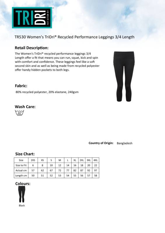 The Women’s TriDri® recycled performance leggings 3/4 length offer a fit that means you can run, squat, kick and spin with comfort and confidence. These leggings feel like a soft second skin; and, as well as being made from recycled polyester, they have handy hidden pockets in both legs.3/4-length leggingsSoft-stretch fabricElasticated waistbandBlack inner waistband and coin pocketSide panels to legs with hidden insert pocketRecycled PolyesterWe recommend using block out vinyl and inks.Product contains no branded neck or waist labelRemovable Kimble or looped garment tagsInner seam label holds important product information on one label with a second label containing brand information which can be cut-away.Accreditations: SEDEX|Amfori BSCI|GRS (Licence)Age Group: AdultFabric: 80% Recycled polyester, 20% ElastaneGender: FemalePlus Size: YesProduct Type: LeggingsSize Range: XXS to 4XLSizing To Fit: XXS 6 XS 8 S 10 M 12 L 14 XL 16 2XL 18 3XL 20 4XL 22Tag: Cut-away inner labelWashing Instructions: Machine wash at 40°C. Line dry. Wash with similar colours. Do not bleach. Warm iron. Do not tumble dry. Do not dry clean. Wash inside out.Weight (GSM): 240gsm]]>