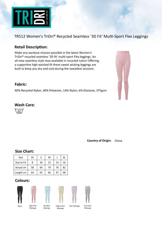 Make any workout mission possible in the latest Women’s TriDri® recycled seamless ‘'3D Fit'’ multi-sport flex leggings, in an all-new seamless style now available in recycled nylon! Offering a supportive, high-waisted, fit these sweat-wicking leggings are built to keep you dry and cool during the toughest sessions.SeamlessWicking fabricDouble-layer waistbandStretchyBody-sculpting design detailingRibbed detailing alongside of legsPocket to legWe recommend using block out vinyl and inks.Product contains no branded neck or waist labelRemovable Kimble or looped garment tagsInner seam label holds important product information on one label with a second label containing brand information which can be cut-away.Accreditations: Amfori BSCI|RecycledAge Group: AdultFabric: 40% Recycled nylon, 40% Polyester, 14% Nylon, 6% ElastaneGender: FemalePlus Size: NoProduct Type: LeggingsSize Range: XS to XLSizing To Fit: XS 8 S 10 M 12 L 14 XL 16Tag: Cut-away inner labelWashing Instructions: Machine wash at 40°C. Line dry. Wash with similar colour. Do not bleach. Do not iron. Do not tumble dry. Do not dry clean. Wash inside out.Weight (GSM): 375gsm]]>