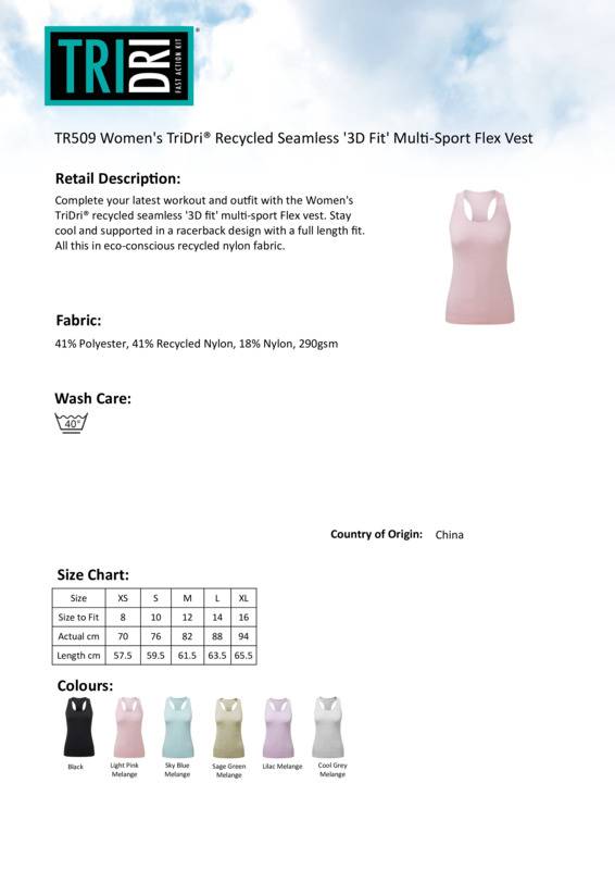 Complete your latest workout and outfit with the women’s TriDri® recycled seamless ‘3D fit’ multi-sport flex vest. Stay cool and supported in a racerback design with a full length fit. All this whilst featuring recycled nylon fabric.Seamless vestBody contour detailingWicking fabricRibbed detailing to side of vestRacerback designWe recommend using block out vinyl and inks.Product contains no branded neck or waist labelRemovable Kimble or looped garment tagsInner seam label holds important product information on one label with a second label containing brand information which can be cut-away.Accreditations: Amfori BSCI|RecycledAge Group: AdultFabric: 41% Polyester, 41% Recycled nylon, 18% NylonGender: FemalePlus Size: NoProduct Type: VestsSize Range: XS to XLSizing To Fit: XS 8 S 10 M 12 L 14 XL 16Tag: Cut-away inner labelWashing Instructions: Machine wash at 40°C. Line dry. Wash with similar colours. Do not bleach. Do not iron. Do not tumble dry. Do not dry clean. Wash inside out.Weight (GSM): 290gsm]]>