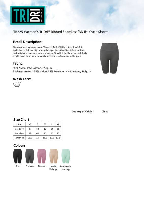 Own your next workout in our Women's TriDri® Ribbed Seamless '3D Fit' cycle shorts. Cut to a high-waisted design, the supportive ribbed contours and waistband provide a form-enhancing fit, whilst the flattering mid-thigh length make them ideal for workout sessions outdoors or in the gym.SeamlessHigh waistband with ‘V’ detailing to backStretchyRibbed detailingPockets to each upper thighWe recommend using block out vinyl and inks.Product contains no branded neck or waist labelRemovable Kimble or looped garment tagsInner seam label holds important product information on one label with a second label containing brand information which can be cut-away.Accreditations: Amfori BSCIAge Group: AdultFabric: 96% Nylon, 4% Elastane - full colour 350gsm. 58% nylon, 38% polyester,4% elastane - melange 365gsm.Gender: FemalePlus Size: NoProduct Type: ShortsSize Range: XS to XLSizing To Fit: XS 8 S 10 M 12 L 14 XL 16Tag: Cut-away inner labelWashing Instructions: Machine wash at 40°C. Line dry. Wash with similar colours. Do not bleach. Do not iron. Do not tumble dry. Do not dry clean. Wash inside out.Weight (GSM): Full colour: 350gsm Melange: 365gsm]]>