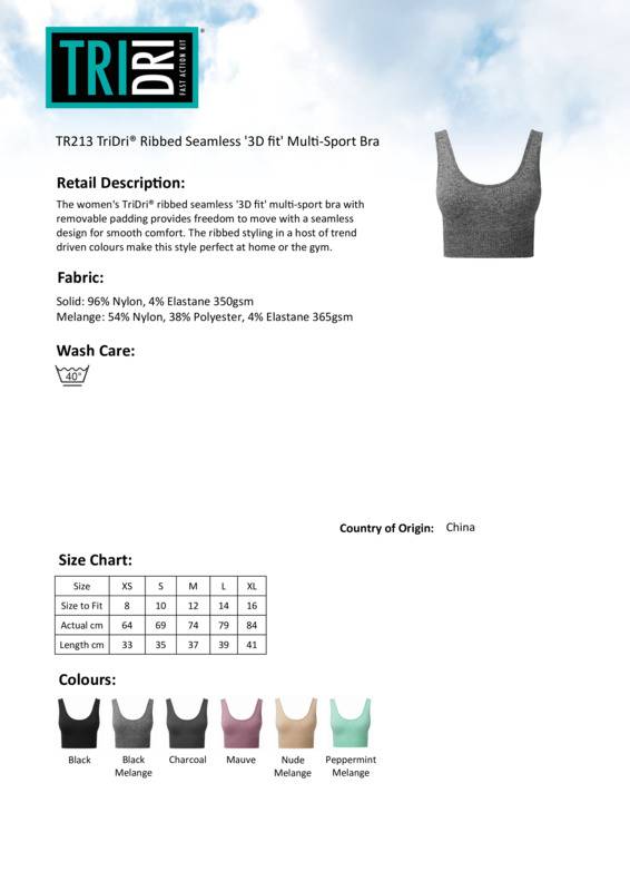 The women's TriDri® ribbed seamless '3D fit' multi-sport bra with removable padding provides freedom to move with a seamless design for smooth comfort. The ribbed styling in a host of trend driven colours make this style perfect at home or the gym.Seamless sports braGrown-on waistbandBody sculpting design detailingRemovable paddingMedium impactWe recommend using block out vinyl and inks.Product contains no branded neck or waist labelRemovable Kimble or looped garment tagsInner seam label holds important product information on one label with a second label containing brand information which can be cut-away.Accreditations: Amfori BSCIAge Group: AdultFabric: 96% Nylon, 4% Elastane - full colour 350gsm. 58% nylon, 38% polyester,4% elastane - melange 365gsm.Gender: FemalePlus Size: NoProduct Type: BrasSize Range: XS to XLSizing To Fit: XS 8 S 10 M 12 L 14 XL 16Tag: Cut-away inner labelWashing Instructions: Wash at 40 degrees. Line dry. Do not bleach. Do not iron. Do not tumble dry. Do not dry clean. Wash with similar colours.Weight (GSM): 350gsm]]>
