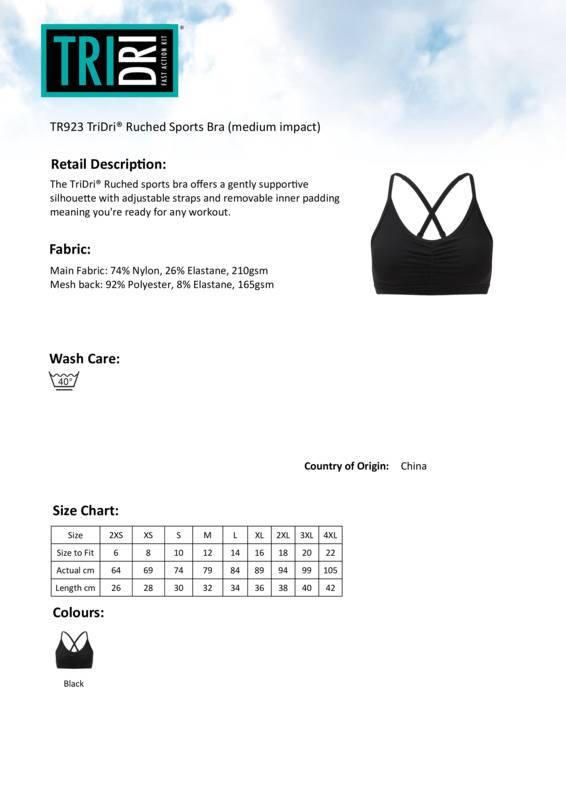 With adjustable straps and removable inner padding, the TriDri® ruched sports bra offers a gently supportive silhouette – meaning you’re ready for any workout.Medium-impact sports braElasticated under bust for added supportRuched detailing to centre frontCross back straps with adjustersRemovable padding innerPanel detailing to back with mesh detail centreWe recommend using block out vinyl and inks.Product contains no branded neck or waist labelRemovable Kimble or looped garment tagsInner seam label holds important product information on one label with a second label containing brand information which can be cut-away.Accreditations: Amfori BSCIAge Group: AdultFabric: Main fabric: 74% Nylon, 26% Elastane.Gender: FemalePlus Size: YesProduct Type: BrasSize Range: XXS to 4XLSizing To Fit: XXS 6 XS 8 S 10 M 12 L 14 XL 16 2XL 18 3XL 20 4XL 22Tag: Cut-away inner labelWashing Instructions: Machine wash at 40°C. Line dry. Wash with similar colours. Do not bleach. Do not iron. Do not tumble dry. Do not dry clean. Wash inside out.Weight (GSM): Main fabric: 210gsm]]>