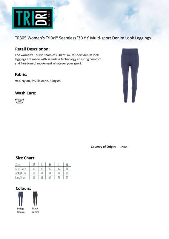 The women's TriDri® seamless '3d fit' multi-sport denim look leggings are made with seamless technology ensuring comfort and freedom of movement whatever your sport.Denim look seamless leggingsStretchyWe recommend using block out vinyl and inks.Product contains no branded neck or waist labelRemovable Kimble or looped garment tagsInner seam label holds important product information on one label with a second label containing brand information which can be cut-away.Accreditations: Amfori BSCIAge Group: AdultFabric: 94% Nylon, 6% ElastaneGender: FemalePlus Size: NoProduct Type: LeggingsSize Range: XS to XLSizing To Fit: XS 8 S 10 M 12 L 14 XL 16Tag: Cut-away inner labelWashing Instructions: 30c Domestic WashWeight (GSM): 350gsm]]>