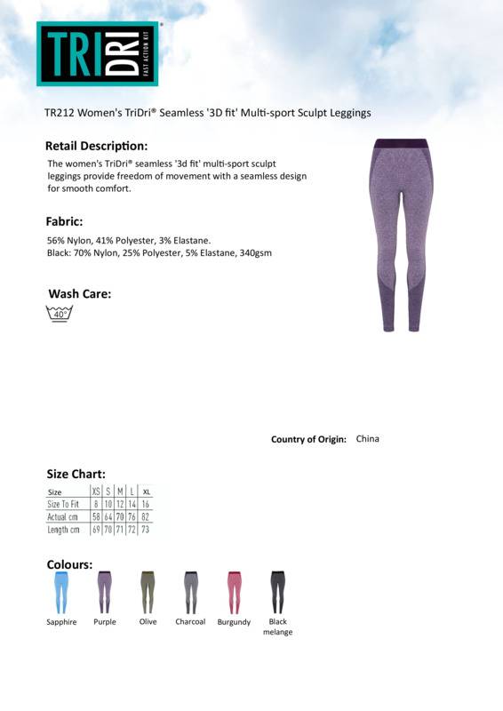 The women's TriDri® seamless '3d fit' multi-sport sculpt leggings provide freedom of movement with a seamless design for smooth comfort.SeamlessGrown on contrast waistbandRibbed cuffsStretchyBody sculpting design detailingWe recommend using block out vinyl and inks.Product contains no branded neck or waist labelRemovable Kimble or looped garment tagsInner seam label holds important product information on one label with a second label containing brand information which can be cut-away.Accreditations: Amfori BSCIAge Group: AdultFabric: 56% Nylon, 41% Polyester, 3% Elastane. Black Melange: 70% Nylon, 25% Polyester, 5% ElastaneGender: FemalePlus Size: NoProduct Type: LeggingsSize Range: XS to XLSizing To Fit: XS 8 S 10 M 12 L 14 XL 16Tag: Cut-away inner labelWashing Instructions: 40c Domestic WashWeight (GSM): 340gsm]]>