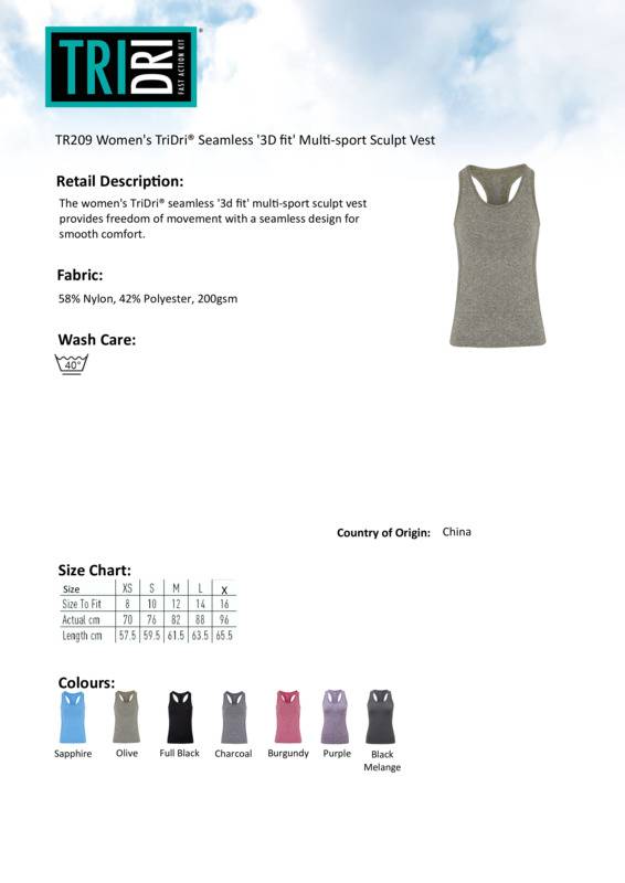 The women's TriDri® seamless '3d fit' multi-sport sculpt vest provides freedom of movement with a seamless design for smooth comfort.Seamless vestContrast detailingWicking fabricBody sculpting design detailingWe recommend using block out vinyl and inks.Product contains no branded neck or waist labelRemovable Kimble or looped garment tagsInner seam label holds important product information on one label with a second label containing brand information which can be cut-away.Accreditations: Amfori BSCIAge Group: AdultFabric: 58% Nylon 42% Polyester. Full Black Fabric: 55% Nylon 45% Polyester. Black Melange: 70% Nylon, 25% Polyester, 5% ElastaneGender: FemalePlus Size: NoProduct Type: VestsSize Range: XS to XLSizing To Fit: XS 8 S 10 M 12 L 14 XL 16Tag: Cut-away inner labelWashing Instructions: 40c Domestic WashWeight (GSM): 200gsm. Full Black Fabric: 155gsm.]]>