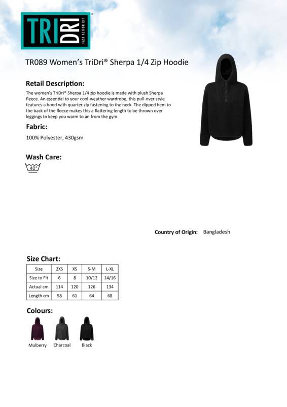 The women's TriDri® Sherpa 1/4 zip hoodie is made with plush Sherpa fleece. An essential to your cool-weather wardrobe, this pull-over style features a hood with quarter zip fastening to the neck. The dipped hem to the back of the fleece makes this a flattering length to be thrown over leggings to keep you warm to and from the gym.Sherpa pull-over fleece with 1/4 zip to frontOversized fitHoodMatching colour binding to hood, hem, and sleevesDrop hem to backWe recommend using block out vinyl and inks.Product contains no branded neck or waist labelRemovable Kimble or looped garment tagsInner seam label holds important product information on one label with a second label containing brand information which can be cut-away.Accreditations: SEDEX|WRAP|Amfori BSCIAge Group: AdultFabric: 100% PolyesterGender: FemalePlus Size: NoProduct Type: HoodiesSize Range: XXS to L/XLSizing To Fit: XXS 6 XS 8 S/M 10/12 L/XL 14/16Tag: Cut-away inner labelWashing Instructions: Wash at 40 degrees. Line dry. Do not bleach. Do not iron. Do not tumble dry. Do not dry clean. Wash with similar colours.Weight (GSM): 430gsm]]>