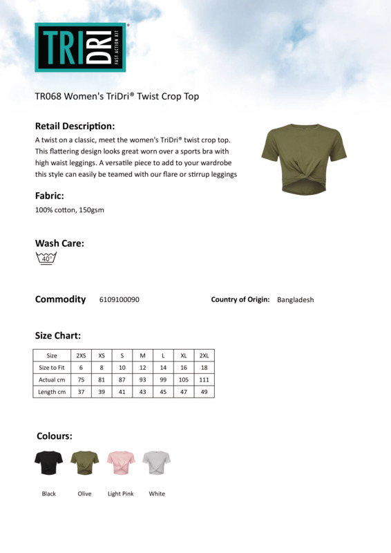 A twist on a classic – meet the women’s TriDri® twist crop top. This flattering design looks great over a sports bra with high waist leggings. A versatile piece to add to your wardrobe, this style can easily be teamed with our flare or stirrup leggings for perfect smart-casual styling.Cropped t-shirtShort sleeveTwist detail to frontCrew neckThe product contains no branded neck or waist labelRemovable kimble or looped garment tagsThe inner seam label holds important product information on one label with a second label containing brand information which can be cut-away.Accreditations: SEDEX|Amfori BSCIAge Group: AdultFabric: 100% CottonGender: FemalePlus Size: NoProduct Type: T-ShirtsSize Range: XXS – 2XLSizing To Fit: XXS 6 XS 8 S 10 M 12 L 14 XL 16 2XL 18Tag: Cut-away inner labelWashing Instructions: Domestic wash at 40?CWeight (GSM): 150gsm]]>