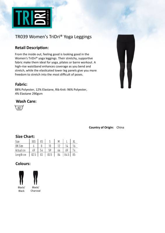From the inside out, feeling good is looking good in the Women's TriDri® yoga leggings. Their stretchy, supportive fabric make them ideal for yoga, Pilates or barre workout. A high-rise waistband enhances coverage as you bend and stretch, while the elasticated lower leg panels give you more freedom to stretch into the most difficult of poses.Yoga leggingsDeep waistbandUpper part Jersey, lower part rib knitElasticated lower leg gives ruched look when wornLined panel between legs for smooth fitWe recommend using block out vinyl and inks.Product contains no branded neck or waist labelRemovable Kimble or looped garment tagsInner seam label holds important product information on one label with a second label containing brand information which can be cut-away.Accreditations: Amfori BSCIAge Group: AdultFabric: 88% Polyester, 12% Elastane. Rib Knit: 96% Polyester, 4% ElastaneGender: FemalePlus Size: NoProduct Type: LeggingsSize Range: XXS to XLSizing To Fit: XXS 6 XS 8 S 10 M 12 L 14 XL 16Tag: Cut-away inner labelWashing Instructions: Domestic wash at 40cWeight (GSM): 290gsm]]>