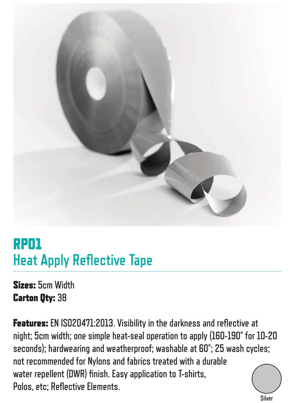 Our heat apply hi-viz tape is the best on the market. With its outstanding visability in the dark environment, hardwearing, weatherproof and easily applied onto any non-coated fabric. Perfect for that little bit extra for the customer.Conforms to EN ISO20471:2013; Visibility in the darkness and reflective at night; 5cm width; One simple heat-seal operation to apply (160-190° for 10-20 seconds); Hardwearing and weatherproof; Washable at 60°; 25 wash cycles; Not recommended for Nylons and fabrics treated with a durable water repellent (DWR) finish; Easy application to T-shirts, Polo's, etc.Age Group: AdultBag Dimensions: 5cm width and 100m/rollFabric: Reflective elementsGender: UnisexPlus Size: NoProduct Type: Reflective TapeSize Range: OnesizeSizing To Fit: One sizeTag: TaglessWashing Instructions: Maximum washing temperature 60ºC. Normal process and wash as synthetics. No bleaching allowed. Do not iron. Do not tumble dry or wring. Do not dry clean, coldrinse and short spin. No professional drycleaning in perchloroethylene or hydrocarbons. Do not wash in biological powder. 25 max. wash cycle.]]>