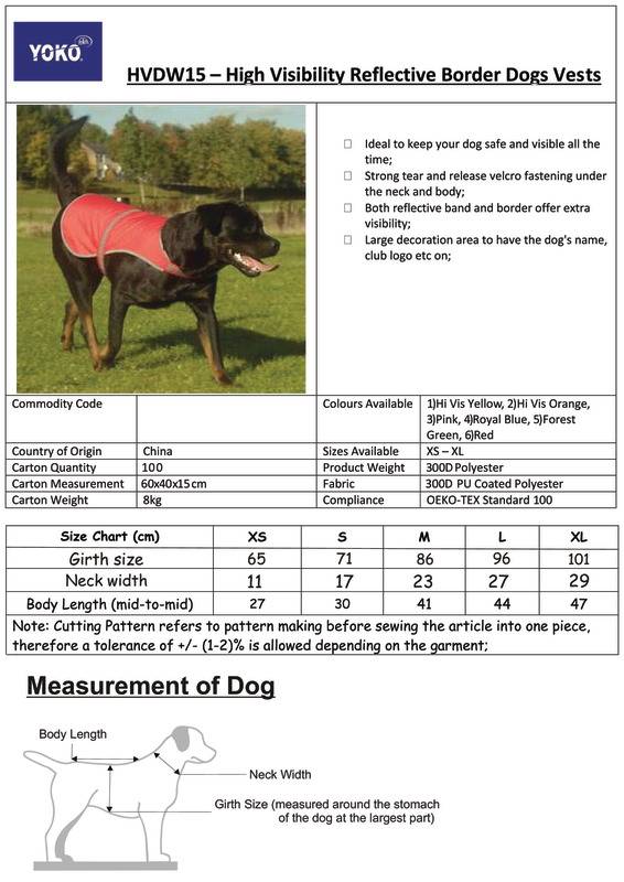Yoko Dog Vest is an ideal little item to keep your dog safe and seen. Easy to put on simply by attaching 2 strong and long hook and loop fastenings. A great gift idea. The dog's name and the dog club's logo can be easily decorated on. Six great colours choices & you can be creative with decoration and make it more unique for your dogs!Ideal to keep your dog safe and visible all the timeStrong tear and release hook and loop fastening under the neck and bodyBoth reflective band and border offer extra visibilityLarge decoration area to have the dog's name, club logo etcOeko-Tex certified.Accreditations: Oeko-TexBag Dimensions: S to fit 6.5″ neck, 9″ back and 15″ girth. M to fit 8″ neck, 13″ back and 19″ girth. L to fit 10″ neck, 17″ back and 24″ girthFabric: 100% PolyesterPlus Size: NoProduct Type: Dog VestsSize Range: S to LSizing To Fit: S M LTag: Sewn TagWashing Instructions: Maximum washing temperature 40ºC. Normal process and wash as synthetics. No bleaching allowed. Do not iron. Do not tumble dry or wring. Do not dry clean, cold rinse and short spin. No professional dry cleaning in perchloroethylene or hydrocarbons. Do not wash in biological powder. 25 max. wash cycle.Weight (GSM): 300D]]>