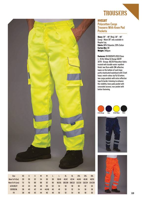 Super popular polycotton Cargo Trouser with knee pad pockets. This product is made of 80/20 polycotton fabric treated with a durable water repellent finish. With a choice of 4 colours, 3M® reflective tape, part elasticated waist and two cargo pockets. What's more to love about this product? Maybe the hidden access for knee pads or the extra hi-viz tape on the pockets. It gives you all!Hi Vis Yellow & Orange conform to EN ISO20471:2013 Class 1and Orange also conforms to RIS-3279-TOMBlack & Navy provide an enhanced visibility for safety80/20 Polycotton fabric treated with durable water repellent finishTwo 5cm width 3M reflective tapes on the bottom of each legsPartly elasticated waistband with 5 belt loopsMatch-colour zip fly & buttonTwo cargo pockets with extra reflective tape & border trimming to enhance the visibilityKnee pads pocket with concealed accessRear pocket with button fastening.Age Group: AdultFabric: 80% Polyester, 20% CottonGender: MaleLeg Length: Leg length: Regular 31″, Long 33'Plus Size: YesProduct Type: TrousersSize Exclusions: *Waist 28″ only available in Regular LegSize Range: 28″ to 48″Reg,LongSizing To Fit: 28″* 30″ 32″ 34″ 36″ 38″ 40″ 42″ 44″ 46″ 48″Tag: Sewn TagWashing Instructions: Maximum washing temperature 40 ºC. Normal process.Do not bleach. Do not iron. Do not tumble dry. Do not dry clean. No industrial laundering. 25 max. wash cycle.Weight (GSM): 340gsm]]>