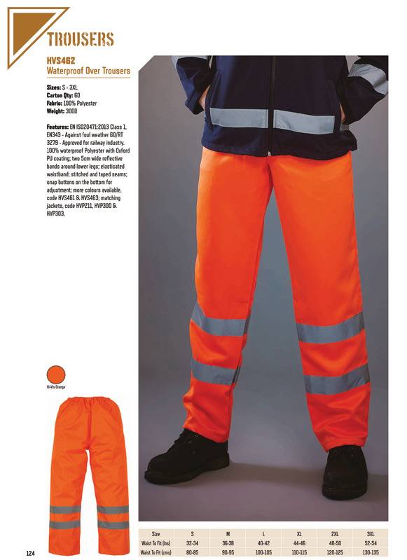 YOKO best selling durable & lightweight waterproof trousers that are easily pulled over your original trousers to protect from wet weather & provide visibility. With an elasticated waist and snap buttons on the bottom for quick adjustment.Conforms to EN ISO20471:2013 Class 1, EN343 against foul weather and RIS-3279-TOMApproved for railway industry100% waterproof Polyester with Oxford PU coatingTwo 5cm wide reflective bands around lower legsElasticated waistbandStitched and taped seamsSnap buttons on the bottom for adjustmentMore colours available, code HVS461 & HVS463Matching jackets, code HVP211, HVP300 & HVP303.Age Group: AdultFabric: 100% PolyesterGender: MalePlus Size: YesProduct Type: TrousersSize Range: S to 3XLSizing To Fit: S 32/34″ M 36/38″ L 40/42″ XL 44/46″ 2XL 48/50″ 3XL 52/54″Tag: Sewn TagWashing Instructions: Maximum washing temperature 40ºC. Normal process & wash as synthetics. Do not bleach. Do not iron. Do not tumble dry or wring. Do not dry clean. Cold rinse & short spin. No professional dry cleaning in perchloroethylene or hydrocarbons. Do not wash in biological powder. 25 max. wash cycle.Weight (GSM): 300D]]>