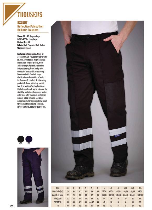 Reflective Polycotton Ballistic Trousers. These trousers have an EN388:2033 tested nylon ballistic patch on the outside of the leg from ankle to thigh. These trousers offer fantastic protection against glass, tin cans and other danerous materials. Ideal garments for local authorities , councils, refuse workers and security guards.Made of 245gsm 65/35 Polycotton fabric with EN388: 2003 tested Nylon ballistic material on outside of legs, from ankle to thigh; Reliable protection and functionality; Front zip fly with concealed hook and bar fastening; Waistband with five belt loops; Elastication at both sides of waist for freedom and comfort; 2 side swing pockets and 1 rear jetted hip pocket; Two 5cm width reflective bands on the bottom of each leg to enhance the visibility; Ballistic nylon panels on the outer legs offer maximum protection against glass, tin cans and other dangerous materials; Suitability: Ideal for local authorities and councils, refuse workers, security guards etc.Age Group: AdultFabric: 65/35% PolycottonGender: MaleLeg Length: Leg length: Regular, LongPlus Size: YesProduct Type: TrousersSize Exclusions: *Waist 28″ only available in Regular legSize Range: 28″ to 48″Reg,LongSizing To Fit: 28″* 30″ 32″ 34″ 36″ 38″ 40″ 42″ 44″ 46″ 48″Tag: Sewn TagWashing Instructions: Maximum washing temperature 40ºC. Normal process and wash as synthetics. No bleaching allowed. Do not iron. Do not tumble dry or wring. Do not dry clean, cold rinse and short spin. No professional dry cleaning in perchloroethylene or hydrocarbons. Do not wash in biological powder. 25 max. wash cycle.Weight (GSM): 245gsm]]>